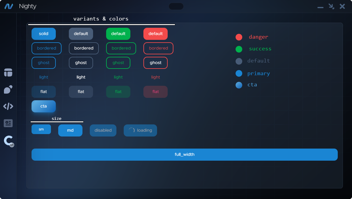 <table><thead><tr><th width="334">Attribute</th><th>Value</th></tr></thead><tbody><tr><td>label</td><td>any <code>string</code></td></tr><tr><td>variant</td><td><p><code>"solid"</code></p><p><code>"bordered"</code></p><p><code>"ghost"</code></p><p><code>"light"</code></p><p><code>"flat"</code></p><p><code>"cta"</code><br><br>Default: <code>"solid"</code></p></td></tr><tr><td>color</td><td><p><code>"primary"</code></p><p><code>"default"</code></p><p><code>"success"</code></p><p><code>"danger"</code><br></p><p>Note: If <code>cta</code> variant is used, custom color will not be applied.</p><p><br>Default: <code>"primary"</code></p></td></tr><tr><td>size</td><td><p><code>"sm"</code></p><p><code>"md"</code><br><br>Default: <code>"md"</code></p></td></tr><tr><td>full_width</td><td><code>True | False</code><br><br>Default: <code>False</code></td></tr><tr><td>disabled</td><td><code>True | False</code><br><br>Default: <code>False</code></td></tr><tr><td>loading</td><td><code>True | False</code><br><br>Default: <code>False</code></td></tr><tr><td>margin</td><td>See <a href="../..#margin">Margin</a>.<br><br>Default: <code>"m-0"</code></td></tr><tr><td>visible</td><td>See <a href="../..#visible">Visible</a>.<br><br>Default: <code>True</code></td></tr></tbody></table>